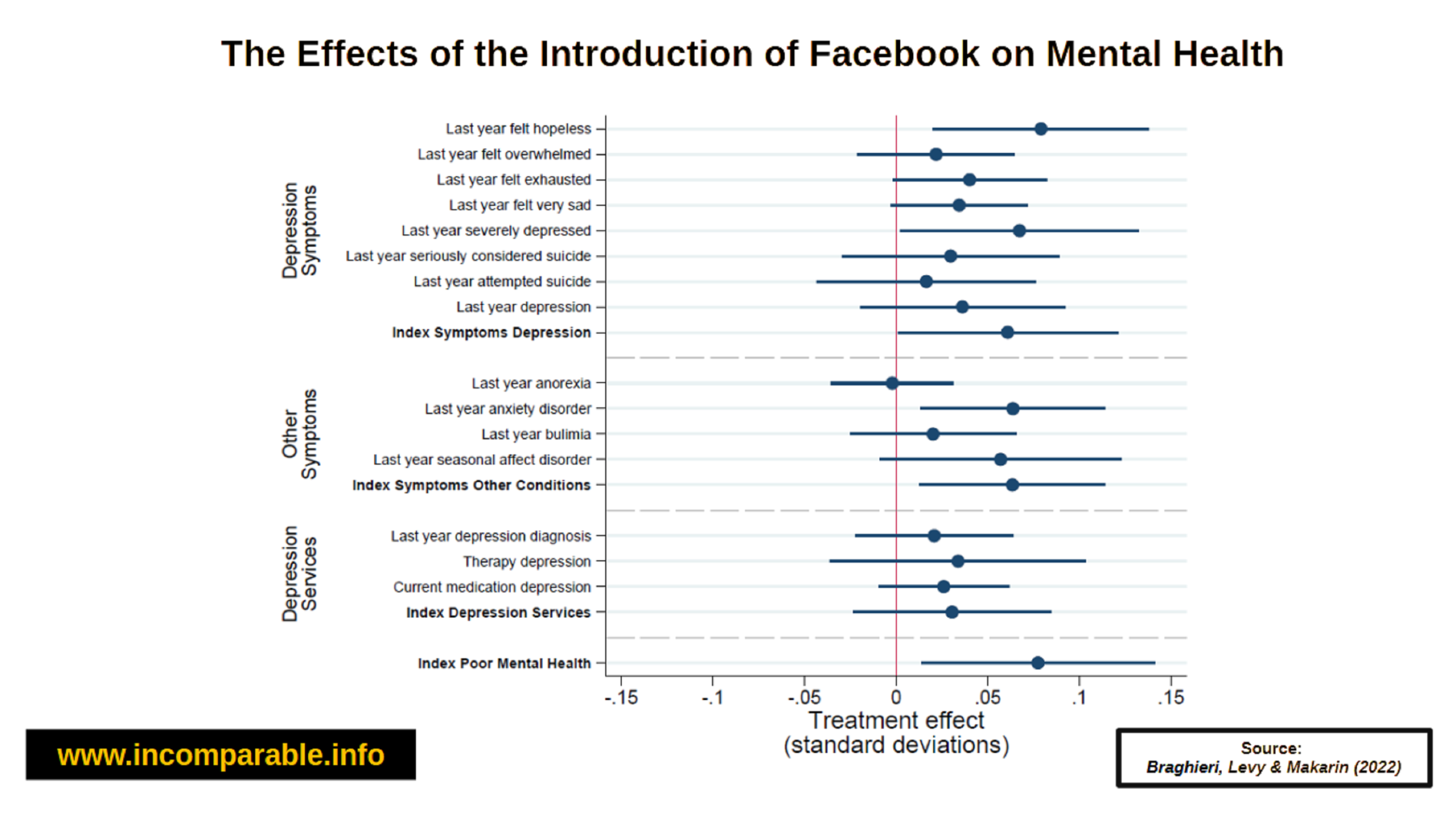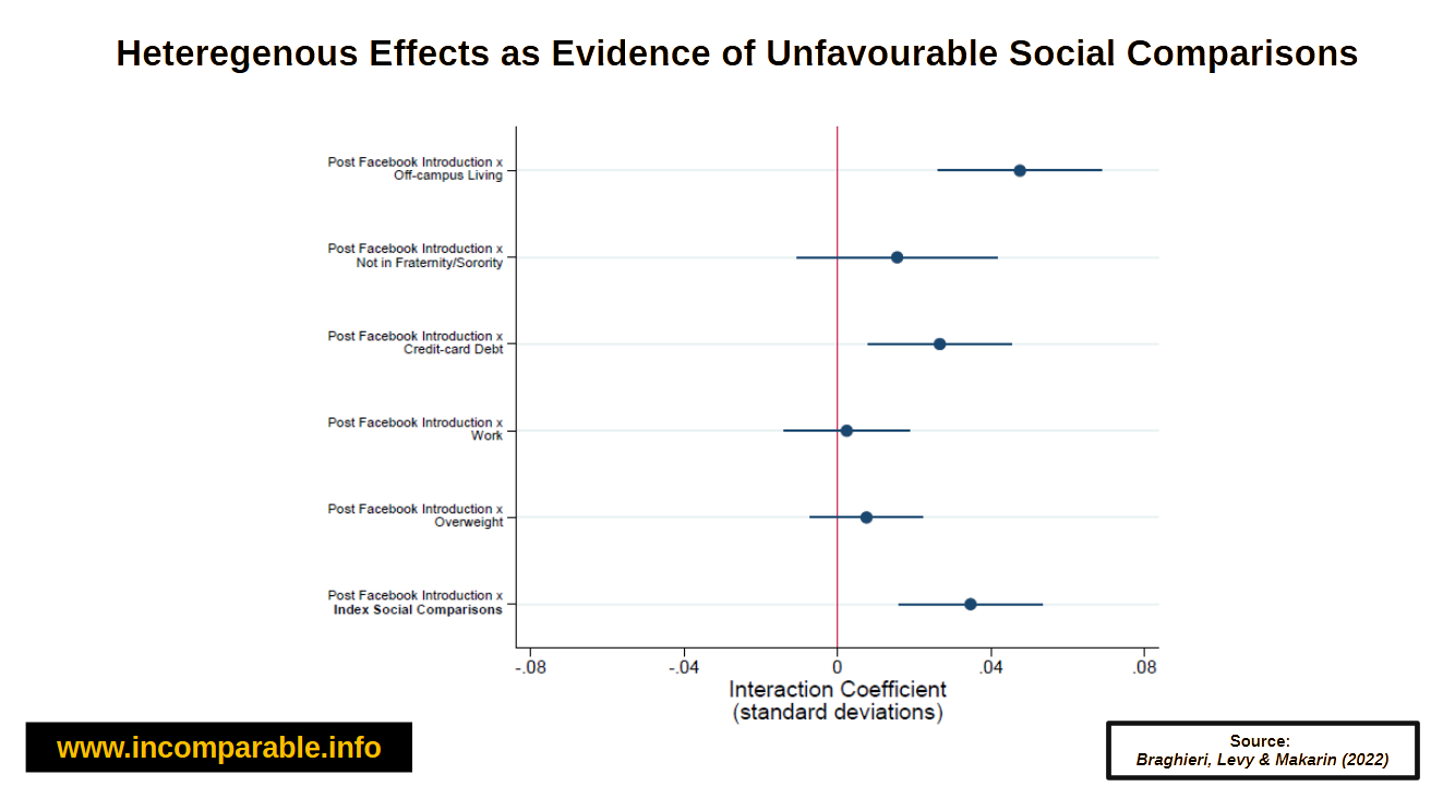 Each dot shows how Facebook’s introduction affected mental health for students with a characteristic linked to greater susceptibility to unfavorable social comparisons (e.g., living off-campus, having credit-card debt). Values to the right of zero mean Facebook had a stronger negative impact for that group; values to the left mean a weaker or opposite effect. The lines show the 95% confidence intervals around each estimate, and when they cross zero it means the interaction effect is not statistically distinguishable from no difference. The index at the bottom summarizes the overall pattern across all characteristics associated with susceptibility to unfavorable social comparisons. See Braghieri, L., Levy, R., & Makarin, A. (2022). Social media and mental health for further details.