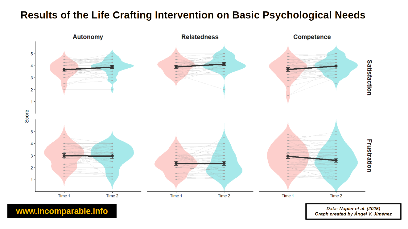 The life crafting intervention was also effective in significantly increasing autonomy, relatedness, and competence satisfaction, and in significantly reducing competence frustration.