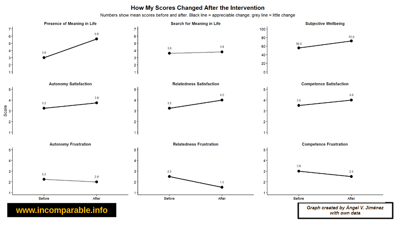 My results are broadly in line with the average results reported in the study, but they align even more closely with the theoretical predictions. In particular, my improvement in wellbeing was considerably larger. All outcomes moved in the expected direction except search for meaning in life and autonomy frustration, which hardly changed.